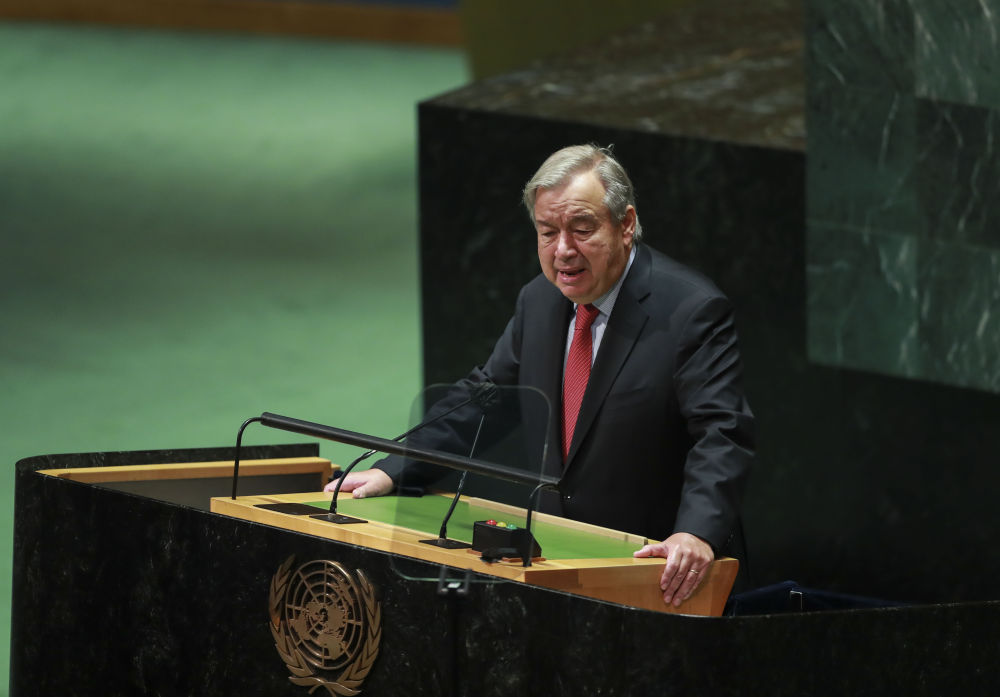9月22日,在位于纽约的联合国总部,联合国秘书长古特雷斯在会议上致辞。(新华社记者王迎摄)
