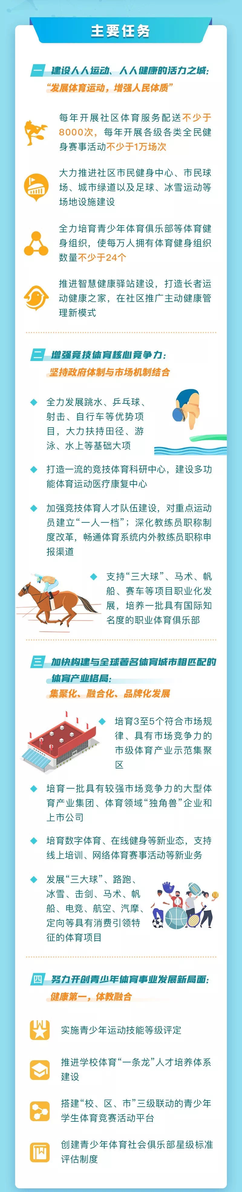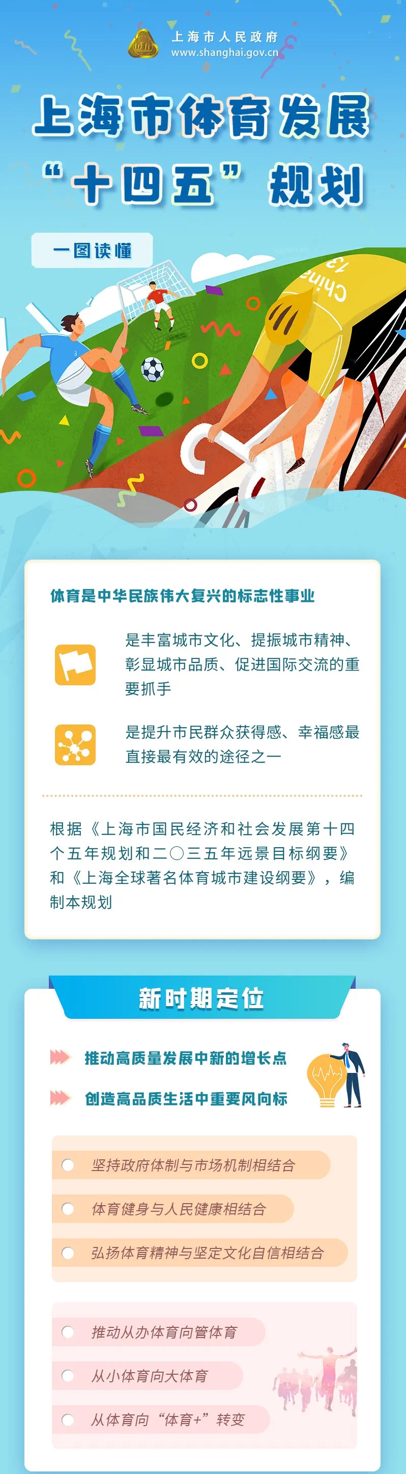 《规划》明确了“十四五”上海体育的发展目标、主要任务和重大项目,绘出了基本建成全球著名体育城市的发展蓝图。《规划》由1个体育总体规划和全民健身、体育设施、体育产业、青少年体育等4个子规划,以及体育赛事、体育人才、体育信息化等多个专项规划共同组成。详见下图: