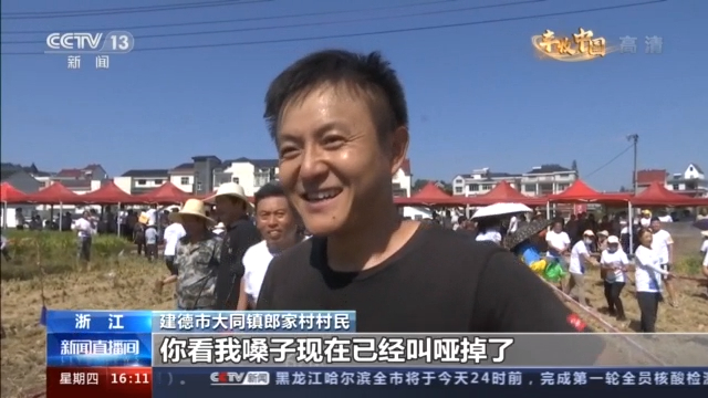 浙江省建德市大同镇郎家村村民:我嗓子都叫哑掉了,大家都很享受这个气氛。作为我们农民来讲很应景,我们周边是一片金黄色,也是象征着一个丰收的季节,展现我们农民丰收的喜悦。