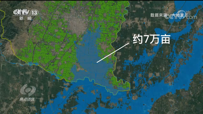 在淇县的卫星遥感图上,绿色是耕地,蓝色代表洪水,大水过后,可以清楚地看到东南部有大部分农田被洪水淹没,面积约达7万亩。