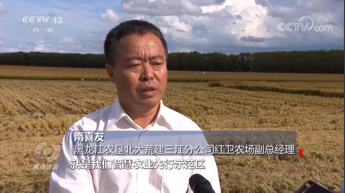 黑龙江农垦北大荒建三江分公司红卫农场副总经理 隋喜友:背后这片地就是智慧农业先行示范区3600亩地,这片地几台收割机能在十天之内收购完毕,全年农业生产一亩地费用能节省60元左右。