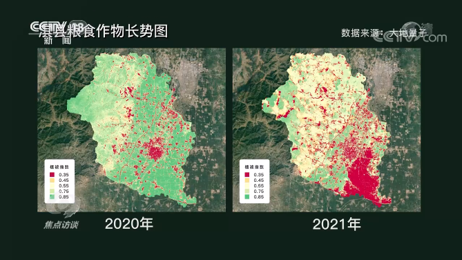 这是今年9月和去年同期的作物长势对比图,越绿表示长势越好,越红则越差,从今年大面积的红色区域可以看到,洪水对淇县农作物生长影响较大。