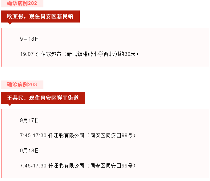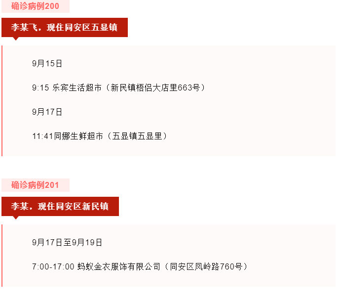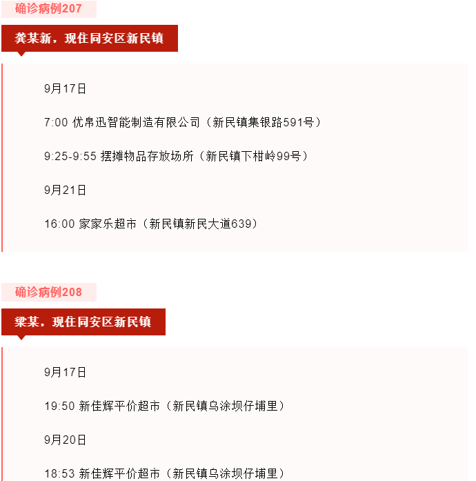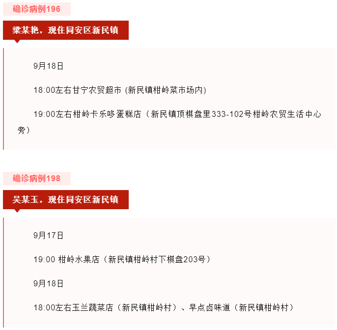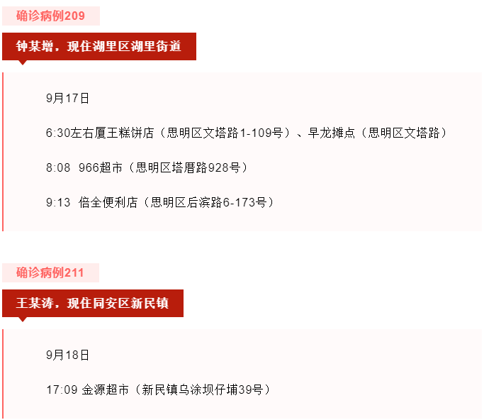 根据疾控等部门流调情况,2021年9月22日厦门市部分新增确诊病例的公共场所活动轨迹公布如下: