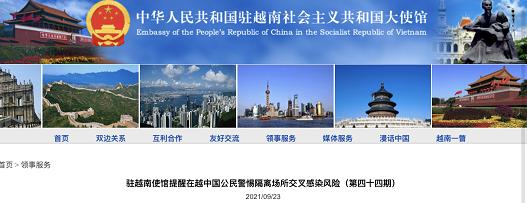 中国驻越南大使馆9月23日在官网发布了对于在越中国公民的健康提示,因近日有多名中国籍船员经陆路口岸回国后确诊新冠肺炎,相关流行病学调查显示不排除系回国前在集中隔离点被感染。