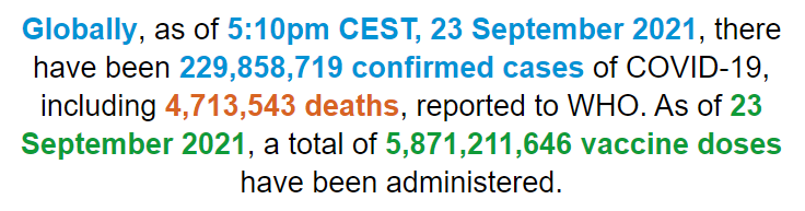 根据世卫组织最新实时统计数据,截至欧洲中部夏令时间9月23日17时10分(北京时间9月23日23时10分),全球累计新冠肺炎确诊病例229858719例,累计死亡病例4713543例。23日全球新冠肺炎确诊病例新增467094例,死亡病例新增8096例。(总台记者 朱赫)