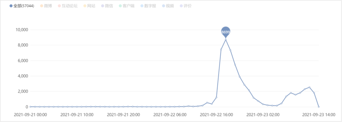 截至2021年9月23日14时,相关舆情信息量共计57046篇,微博50969篇,客户端3050篇,互动论坛1523篇,视频734篇,网站493篇,微信268篇,数字报9篇。其中,微博为本次舆情信息的主要来源,占比为89.35%。