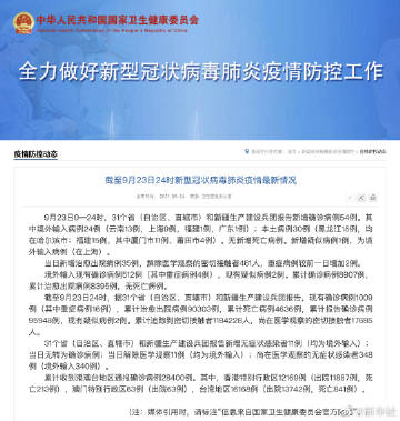 【#9月23日新增确诊病例54例# #9月23日新增本土病例30例#】据国家卫生健康委员会网站,9月23日0—24时,31个省(自治区、直辖市)和新疆生产建设兵团报告新增确诊病例54例。其中境外输入病例24例(云南13例,上海9例,福建1例,广东1例);本土病例30例(黑龙江15例,均在哈尔滨市;福建15例,其中厦门市11例、莆田市4例)。无新增死亡病例。新增疑似病例1例,为境外输入病例(在上海)。