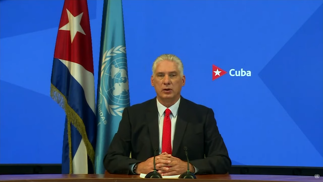 △古巴国家主席迪亚斯-卡内尔23日在第76届联合国大会一般性辩论中发言(图片来源:联合国)