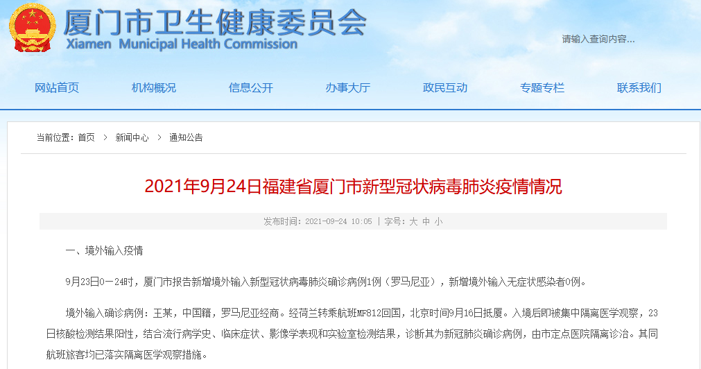 9月23日0—24时,厦门市报告新增境外输入新型冠状病毒肺炎确诊病例1例(罗马尼亚),新增境外输入无症状感染者0例。