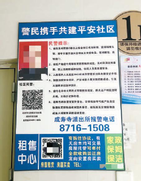 然而,成寿寺派出所的民警告诉记者,他们仅张贴过印有开锁公司联系方式的民警提示,至于含有其他小广告的民警提示,均非派出所张贴。“照片上的人物的确是社区民警,但民警证件照应该是白底的,而这个是红底的,大家千万别信!”
