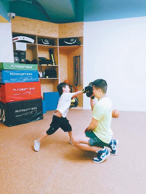 体能运动中心提供各种课程,一位小朋友在体验拳击。