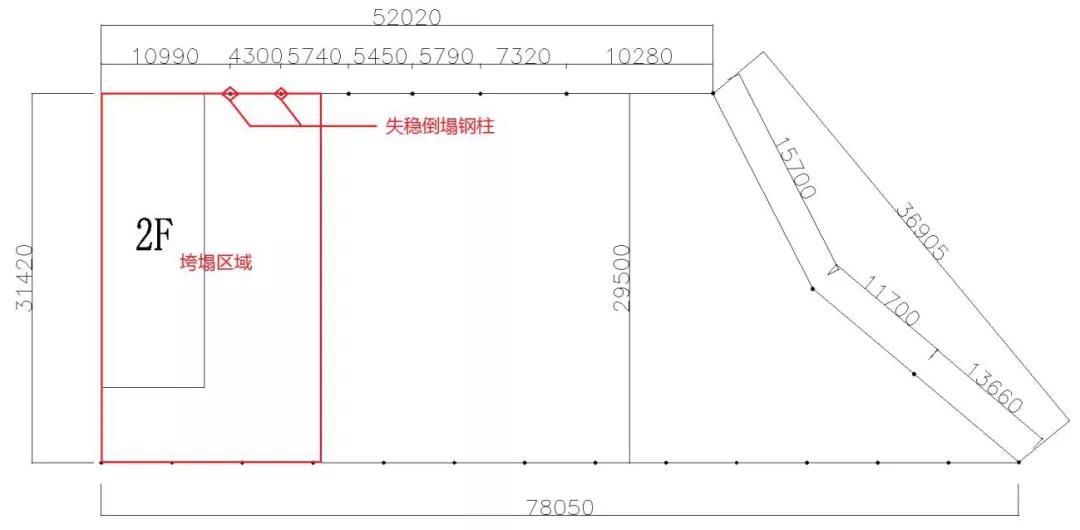 罩棚坍塌区域横向三跨共计约15.5米,纵向柱距约29.5米,垮塌面积约457.25平方米。东南方向2根钢质立柱倒塌(1根为圆型钢柱、1根为矩形格构式钢柱),4榀桁架垮塌折断。