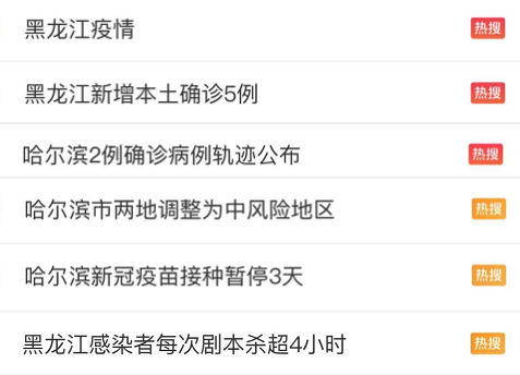 与黑龙江疫情相关的话题热度大幅升高。截至9月22日12时,“哈尔滨市两地调整为中风险地区”“黑龙江感染者每次剧本杀超4小时”等成为网民关注的热点话题。