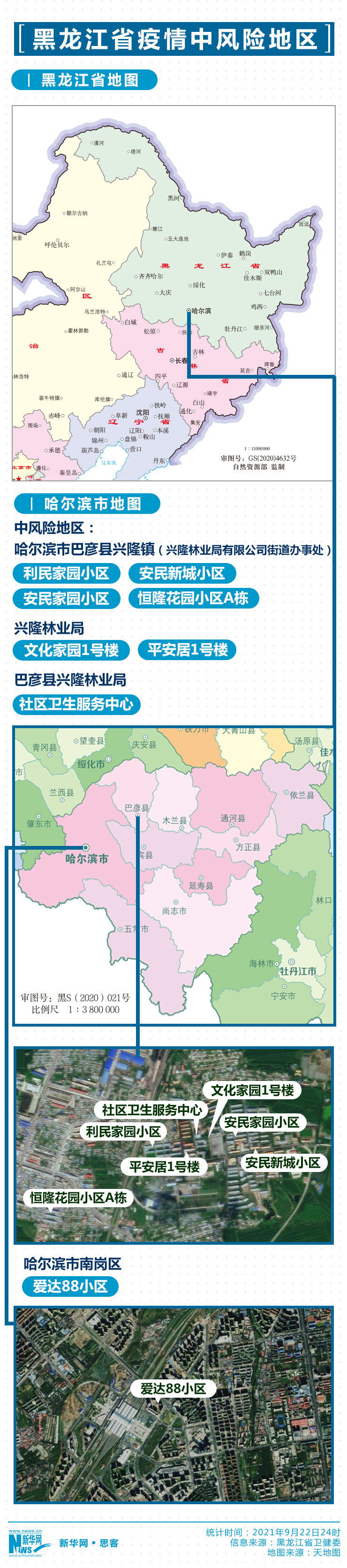 疫情地图显示,哈尔滨市南岗区爱达88小区、哈尔滨市巴彦县兴隆镇(兴隆林业局有限公司街道办事处)利民家园小区、安民家园小区、安民新城小区、恒隆花园小区A栋,兴隆林业局文化家园1号楼、兴隆林业局平安居1号楼,巴彦县兴隆林业局社区卫生服务中心为中风险地区。