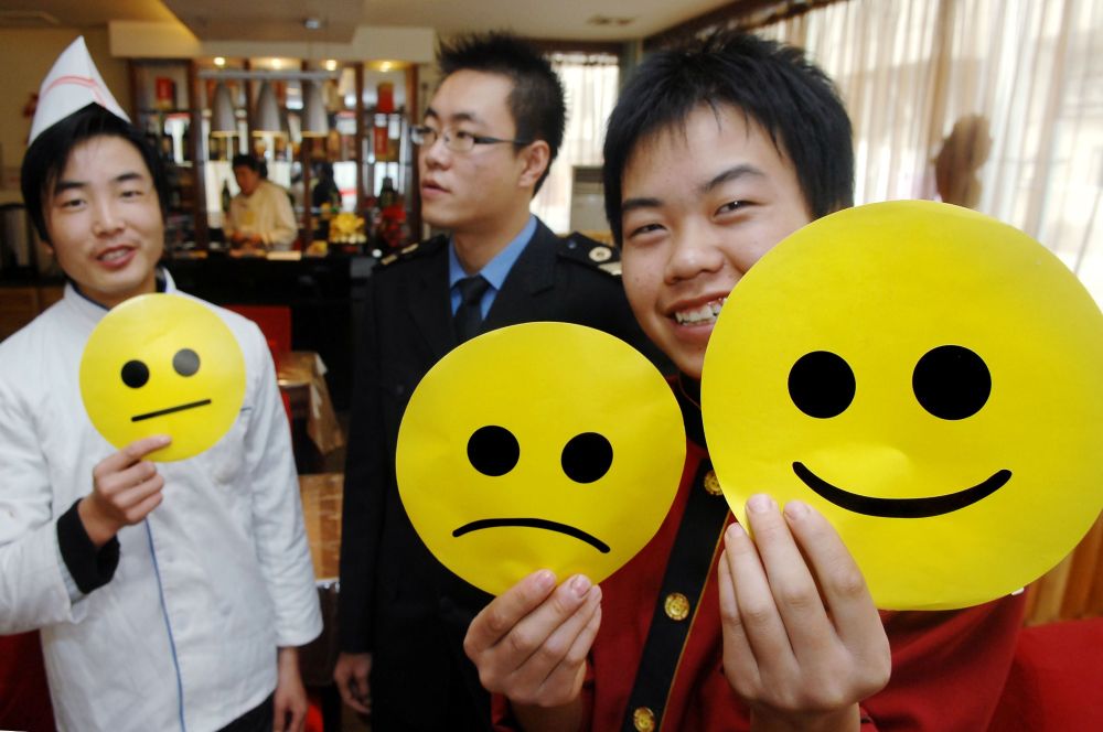 2007年11月12日,银川市一餐馆服务人员在展示餐馆卫生状况“表情”符号。(新华社记者李紫恒摄)