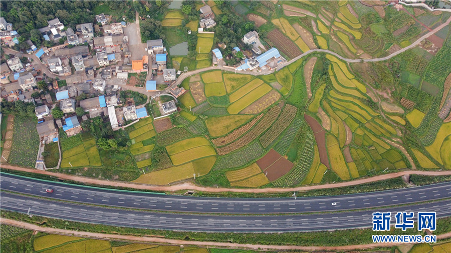 航拍云南省曲靖市沾益区龙华街道石羊社区田野与公路(9月15日摄)。新华网发(杨俊鹏 摄)