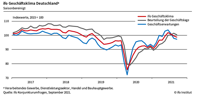 德国智库伊弗经济研究所当地时间9月24日公布的统计数据显示,德国经济界的情绪持续受到抑制:德国9月份商业景气指数依旧环比下跌,从8月的99.6点小幅下滑至98.8点。这已是该指数连续三个月环比下降。