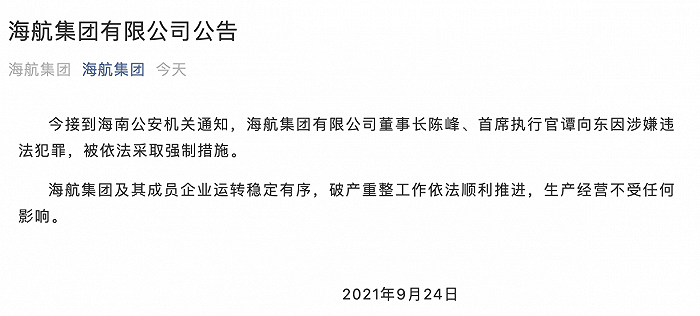 央视网消息:9月24日,海航集团公告,今接到海南公安机关通知,海航集团有限公司董事长陈峰、首席执行官谭向东因涉嫌违法犯罪,被依法采取强制措施。海航集团及其成员企业运转稳定有序,破产重整工作依法顺利推进,生产经营不受任何影响。