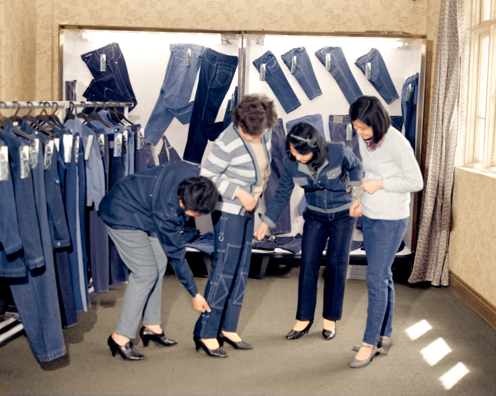 这是1987年拍摄的天津市服装七厂的职工们在试穿出口的牛仔裤。新华社发