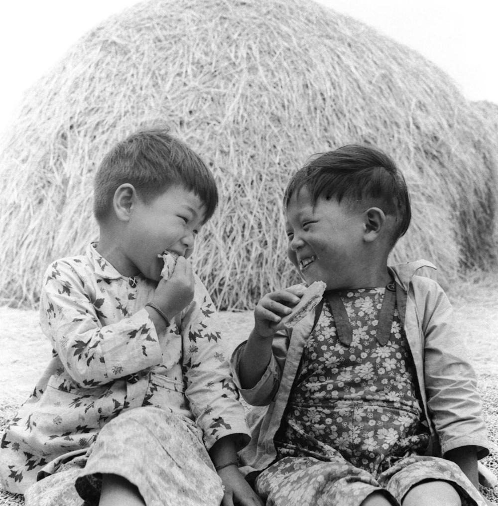淮河两岸的千里平原上,1957年获得一个丰硕的小麦收成,孩子们在开心地吃饼。新华社发
