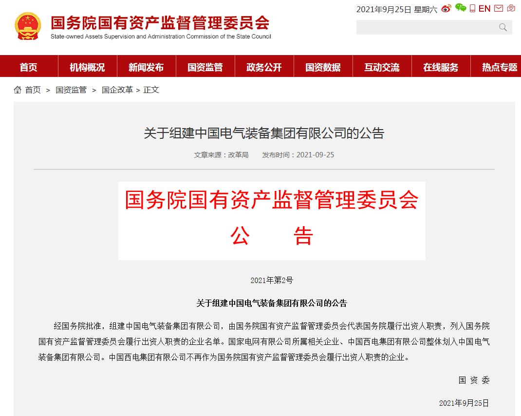 央视网消息:据国资委网站消息,经国务院批准,组建中国电气装备集团有限公司,由国务院国有资产监督管理委员会代表国务院履行出资人职责,列入国务院国有资产监督管理委员会履行出资人职责的企业名单。国家电网有限公司所属相关企业、中国西电(6.410, -0.27, -4.04%)集团有限公司整体划入中国电气装备集团有限公司。中国西电集团有限公司不再作为国务院国有资产监督管理委员会履行出资人职责的企业。