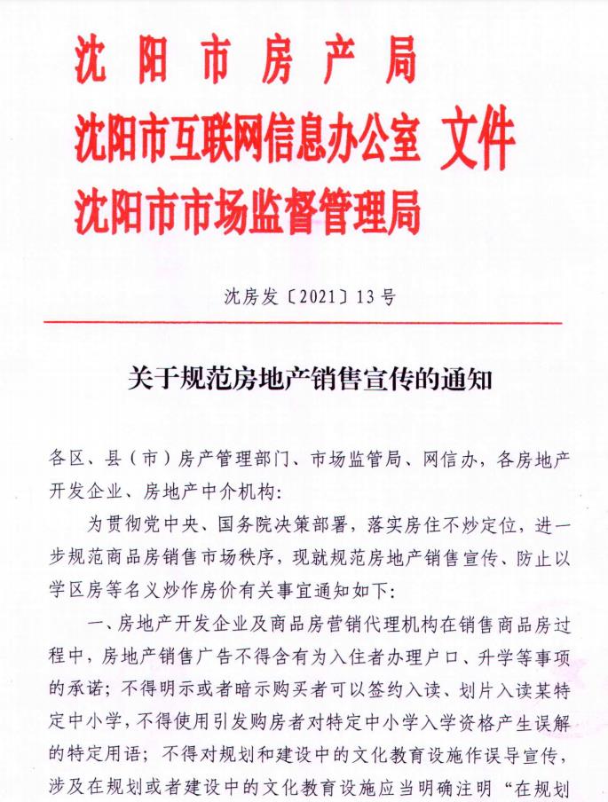 央视网消息:据沈阳市房产局网站消息,日前,沈阳市房产局、沈阳市市场监督管理局、沈阳市互联网信息办公室联合发布了《关于规范房地产销售宣传的通知》。其中明确,房产中介不得以学区房名义挂牌二手房;房地产销售广告不得明示或者暗示购买者可以签约入读、划片入读某特定中小学。