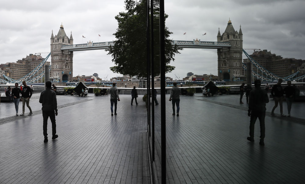 8月13日,人们走过英国伦敦塔桥附近的街道。(新华社记者韩岩摄)