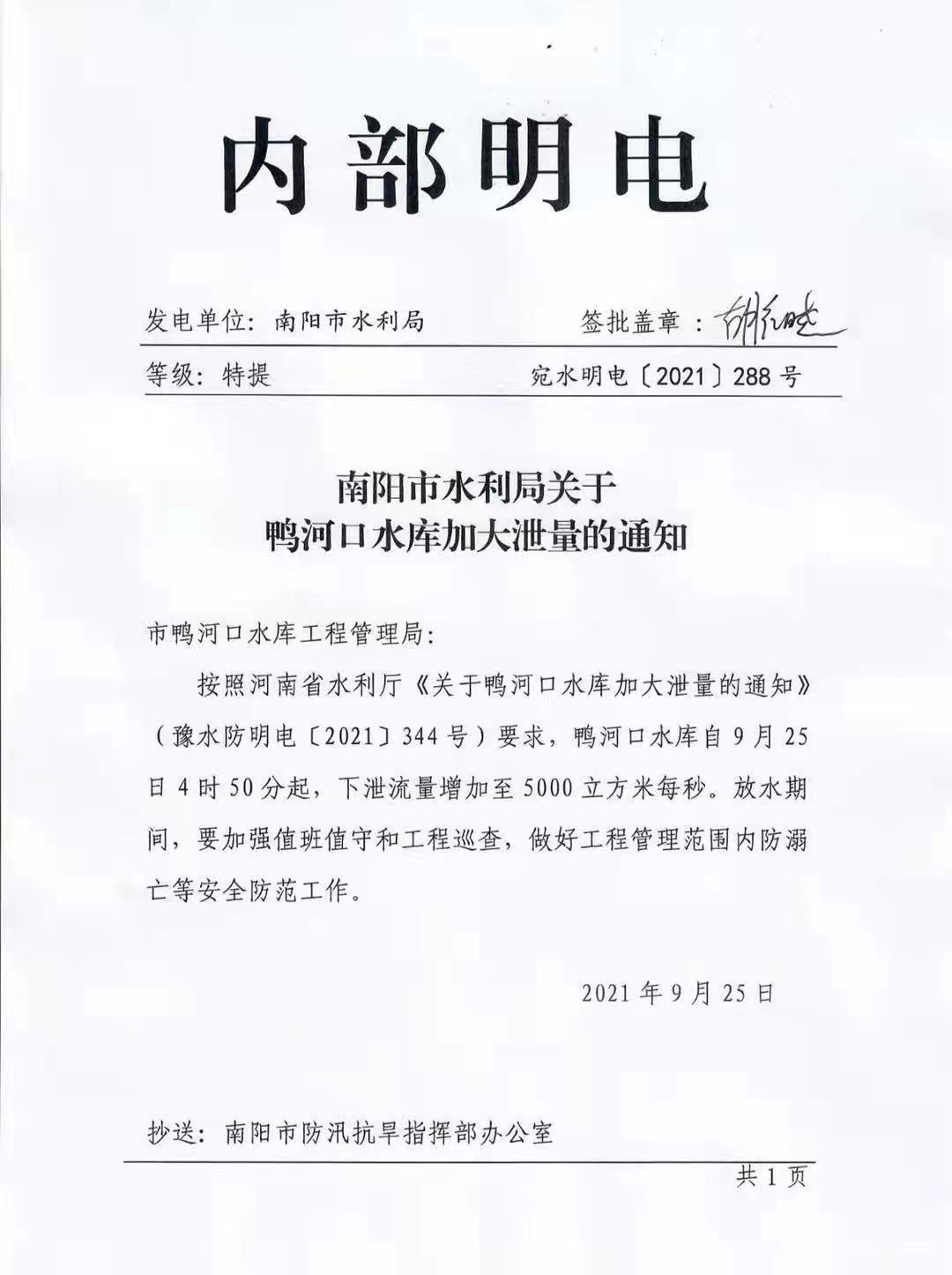 9月24日06时至9月25日06时,河南南阳北部遇特大暴雨。鸭河口水库自9月25日4时起加大下泄流量,泄洪流量将达到白河最大行洪能力,南阳市中心城区低洼处有较大可能形成内涝。