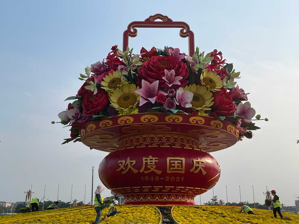 天安门广场中心布置“祝福祖国”主题花坛,花坛顶高18米,篮体书写“祝福祖国”、“欢度国庆”等字样。花坛底部直径45米,为向日葵图案,寓意朵朵葵花向太阳。广场两侧绿地延续吉祥如意花带布置方式,花卉布置总面积5050平方米,两侧花球共18个。长安街沿线设置了十处主题花坛,在建国门至复兴门之间,布置地栽花卉7000平方米,布置容器花卉100组,营造出热烈、喜庆、欢乐的节日氛围。