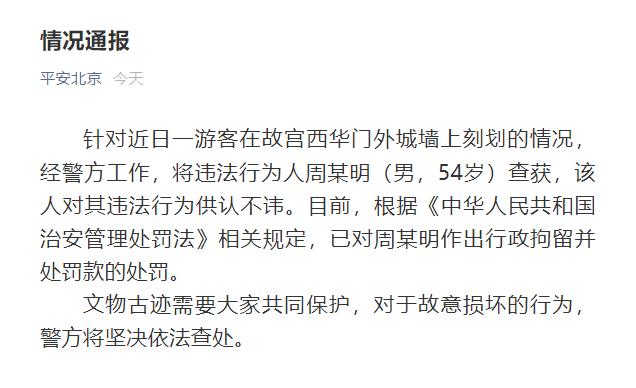 据微信公众号“平安北京”消息,针对近日一游客在故宫西华门外城墙上刻划的情况,经警方工作,将违法行为人周某明(男,54岁)查获,该人对其违法行为供认不讳。目前,根据《中华人民共和国治安管理处罚法》相关规定,已对周某明作出行政拘留并处罚款的处罚。