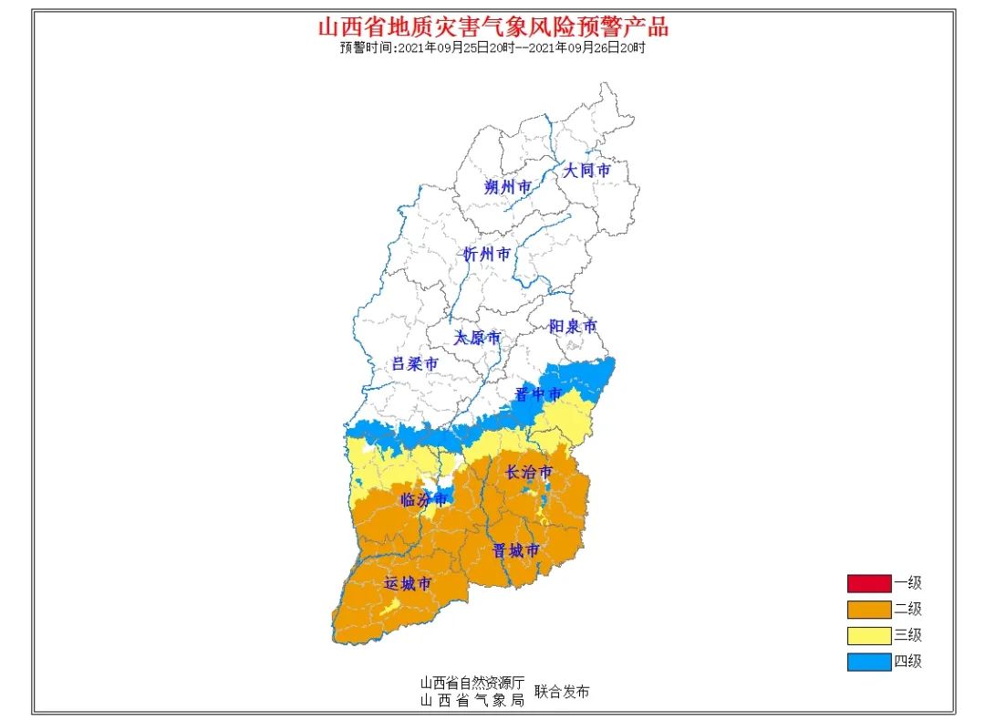 9月25日17时22分,自然资源厅和山西省气象局联合发布地质灾害气象风险预警:受较强降水影响,预计未来24小时,晋城、运城、临汾中南部、长治中南部等地的部分区域地质灾害气象风险预警等级为橙色,有高地质灾害气象风险;长治北部、临汾北部、晋中东部等地的部分区域地质灾害气象风险预警等级为黄色,有较高地质灾害气象风险。请相关部门做好地质灾害防治工作。