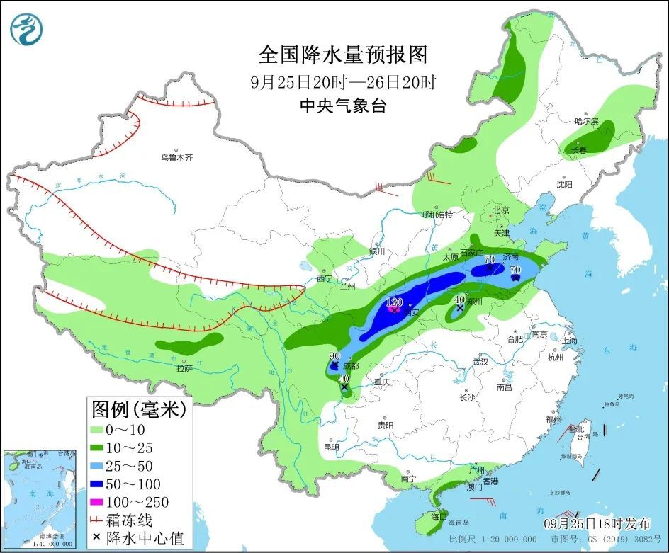 9月25日20时至26日20时,四川盆地西部、西北地区东南部、华北南部、黄淮等地部分地区有中到大雨,其中,四川盆地西北部、甘肃东南部、陕西中部和西南部、山西南部、河北南部、河南北部、山东中西部等地部分地区有暴雨或大暴雨。