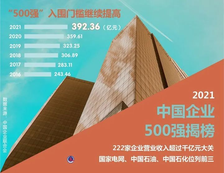 “2021中国企业500强”榜单发布:500强企业2020年共实现营业收入89.83万亿元,其中营收超千亿元企业数量增至222家。