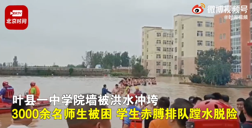 ·河南平顶山一中学严重内涝3000余名师生被困,学生赤膀排队趟水脱险。