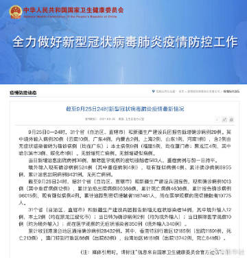【#9月25日新增确诊病例29例# #9月25日新增本土病例9例#】据国家卫生健康委员会网站,9月25日0—24时,31个省(自治区、直辖市)和新疆生产建设兵团报告新增确诊病例29例。其中境外输入病例20例(云南10例,广东4例,内蒙古2例,上海2例,山东1例,河南1例),含2例由无症状感染者转为确诊病例(均在广东);本土病例9例(福建5例,均在厦门市;黑龙江4例,其中哈尔滨市3例、绥化市1例)。无新增死亡病例。无新增疑似病例。