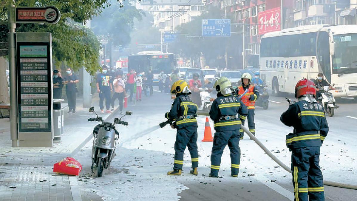 昨天下午3时50分,西城区右安门内大街北向南方向,一辆电动自行车突然冒烟,随后出现明火并伴有爆炸声。10分钟后多辆消防车赶到现场,明火很快被扑灭。