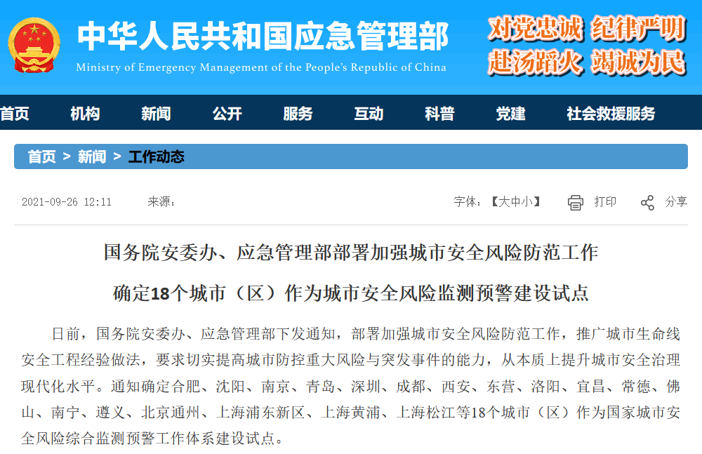 央视网消息:据应急管理部网站消息,日前,国务院安委办、应急管理部下发通知,部署加强城市安全风险防范工作,推广城市生命线安全工程经验做法,要求切实提高城市防控重大风险与突发事件的能力,从本质上提升城市安全治理现代化水平。通知确定合肥、沈阳、南京、青岛、深圳、成都、西安、东营、洛阳、宜昌、常德、佛山、南宁、遵义、北京通州、上海浦东新区、上海黄浦、上海松江等18个城市(区)作为国家城市安全风险综合监测预警工作体系建设试点