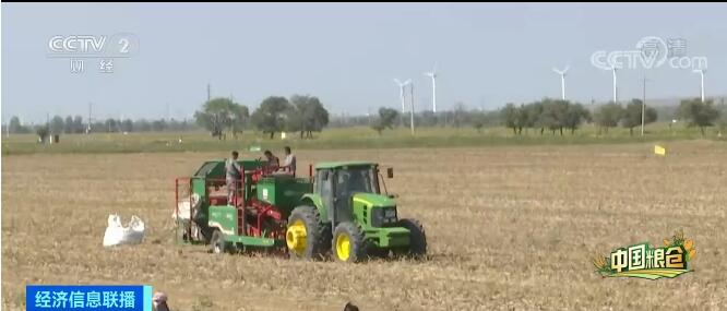 记者 袁艺:这片地里收土豆是靠团结协作拼手速,而一路之隔则是另一番收获景象。在这片近700亩地里种的土豆主要用于淀粉加工,这台正在作业的联合收割机从翻土到抖土再到装袋一气呵成,远远看去这个大家伙好像有点笨重,但是从机器上的一个拍摄视角我们看到,土豆在传送带上飞速旋转,它的效率可以达到每小时5亩地。