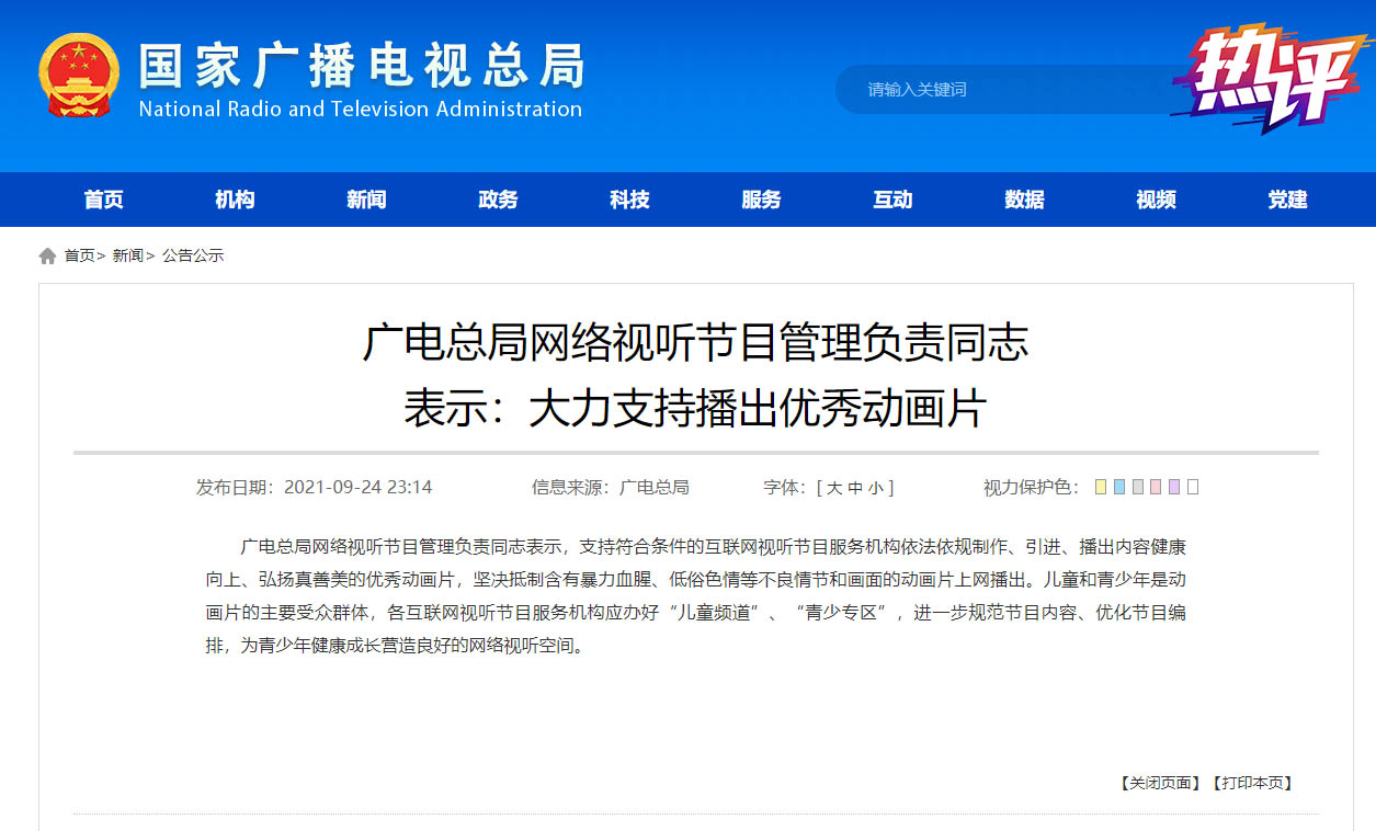 今年4月,江苏省消保委发布《动画领域侵害未成年人成长安全消费调查报告》,选取21部未成年人动画片、梳理出1465个问题点,涉及暴力犯罪、危险动作、广告营销等,报告并建议从“受众年龄”和“动画内容”两个维度探索动画分级制度。9月24日,广电总局网络视听节目管理负责同志表示,各互联网视听节目服务机构应办好“儿童频道”“青少专区”,进一步规范节目内容、优化节目编排,为青少年健康成长营造良好的网络视听空间。——消除未成年人成长中的安全隐患和不良导向,关乎每个小家庭的幸福与全社会的安定,需要有关部门严格监管、有力引导。
