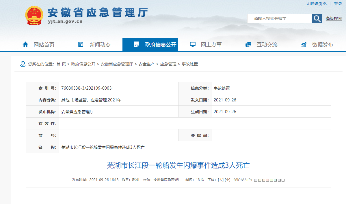 央视网消息:据安徽省应急管理厅网站消息,9月25日晚,浙江省华泓海运有限公司所属“华泓18”轮(散装化学品船,最低配员11人,实际在船船员11人)在芜湖市鸠江区长江段的东梁山危险品停泊区锚泊时,轮机长等3名船员下舱作业,22时40分左右发生闪爆,致3人受伤。9月26日凌晨,3人经医院抢救无效死亡。