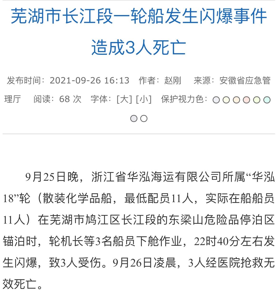 据安徽省应急管理厅消息,9月25日晚,浙江省华泓海运有限公司所属“华泓18”轮(散装化学品船,最低配员11人,实际在船船员11人)在芜湖市鸠江区长江段的东梁山危险品停泊区锚泊时,轮机长等3名船员下舱作业,22时40分左右发生闪爆,致3人受伤。9月26日凌晨,3人经医院抢救无效死亡。