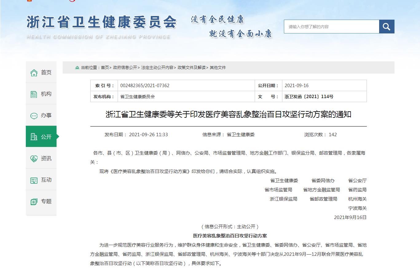 为进一步规范医疗美容行业服务行为,维护群众身体健康和生命安全,省卫生健康委、省委网信办、省公安厅、省市场监管局、省地方金融监管局、省药监局、浙江银保监局、省邮政管理局、杭州海关、宁波海关等十部门决定从2021年9月—12月联合开展医疗美容乱象整治百日攻坚行动(以下简称百日攻坚行动),具体要求如下。