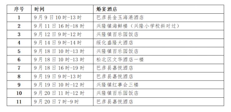 一、主动报备行程。请参加以下婚宴的人自觉履行疫情防控义务,第一时间向所在社区(村)或工作单位报备,主动配合社区尽快开展落实隔离管控、新冠病毒核酸检测、健康监测等各项防控措施。如未报备造成疫情扩散的,将被依法追究法律责任。