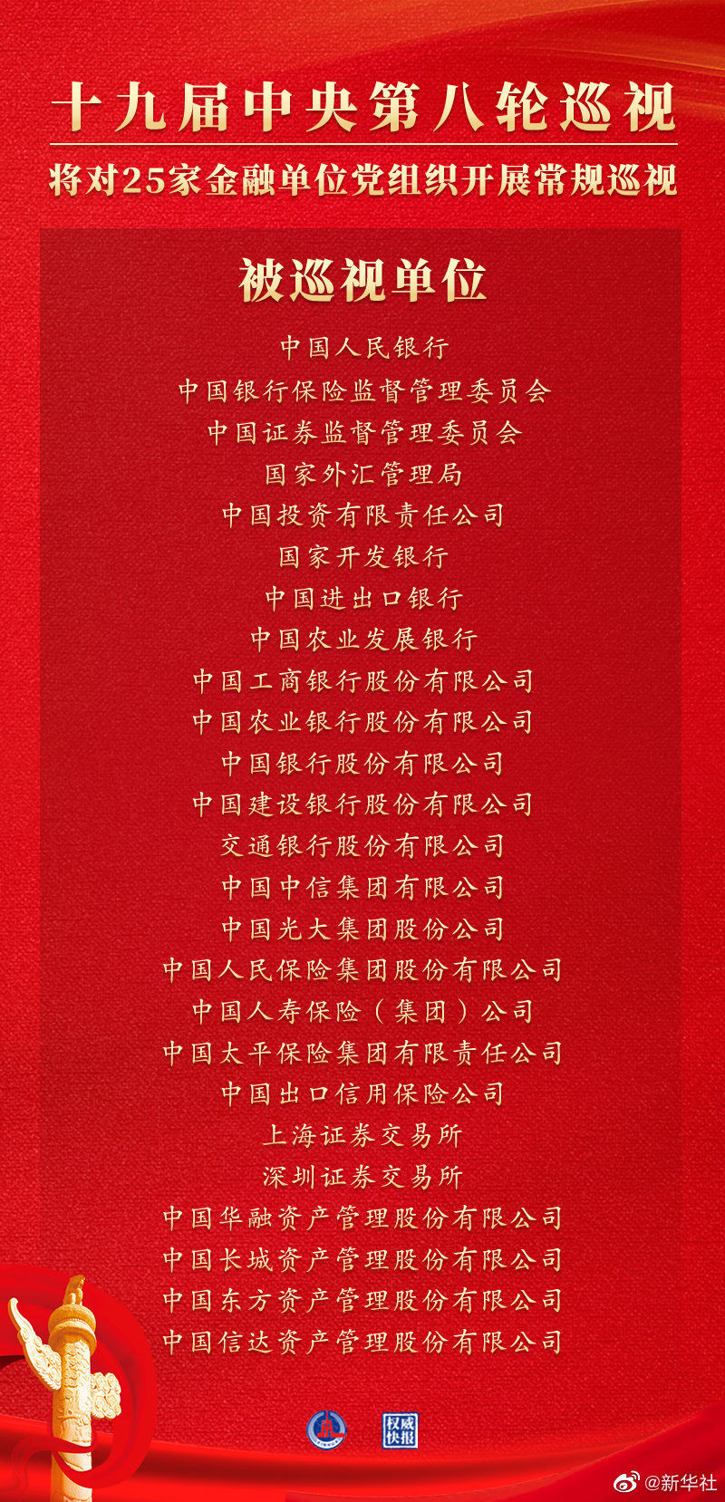 经党中央批准,十九届中央第八轮巡视将对25家金融单位党组织开展常规巡视。详情>>>