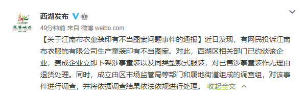 近日发现,有网民投诉江南布衣服饰有限公司生产童装印有不当图案。对此,西湖区相关部门已约谈该企业,责成企业立即下架涉事童装以及同类型款式服装,对已售涉事童装作无理由退货处理。详情>>>