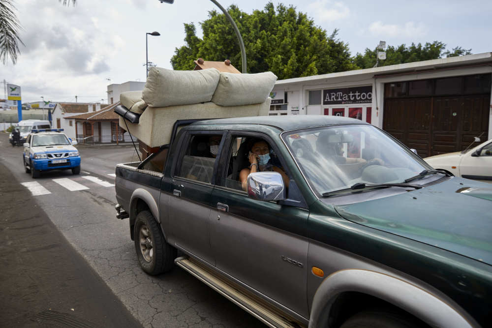 9月24日,西班牙拉帕尔马岛居民载着家具驶离受火山影响的区域。拉帕尔马岛的老昆布雷火山自9月24日开始喷发加剧,岛上机场于25日关闭,进出岛的方式只剩下轮渡,大批民众紧急撤离。(新华社记者 孟鼎博摄)