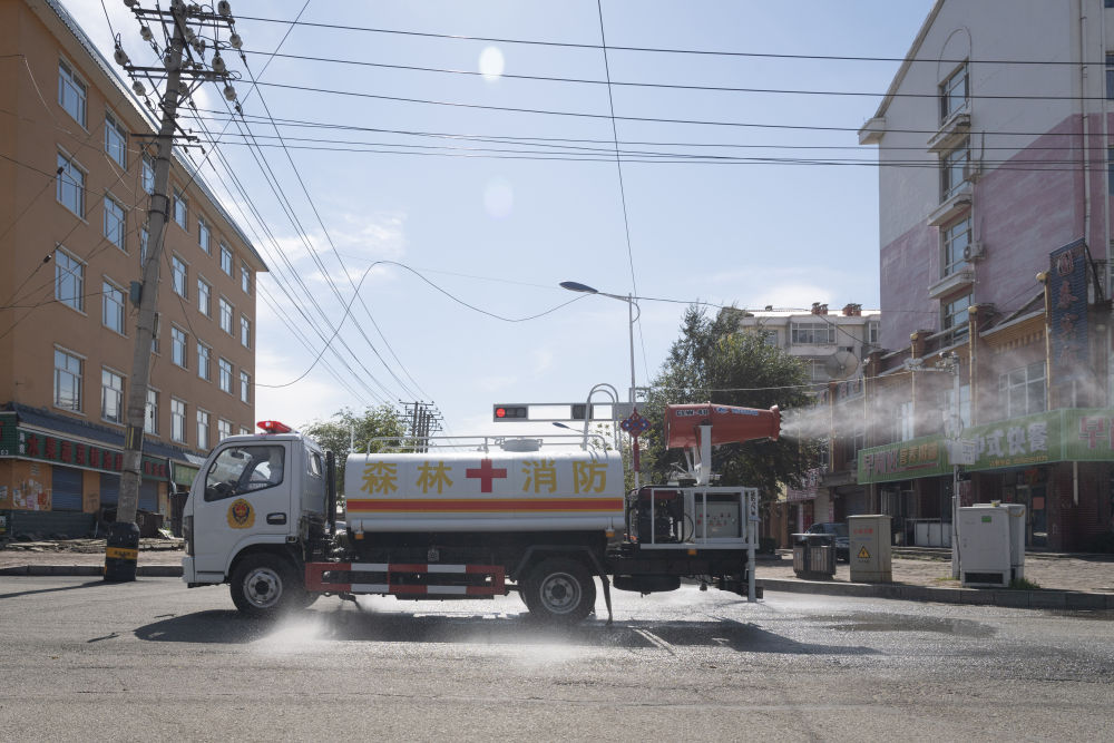 ↑9月24日,在哈尔滨市巴彦县兴隆镇,哈尔滨市森林消防支队兴隆大队的消防员开启车上的消杀设备。
