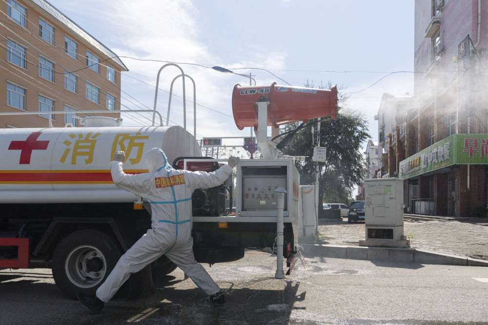 ↑9月24日,哈尔滨市森林消防支队兴隆大队的消防员驾驶车辆对兴隆镇街道进行消杀。
