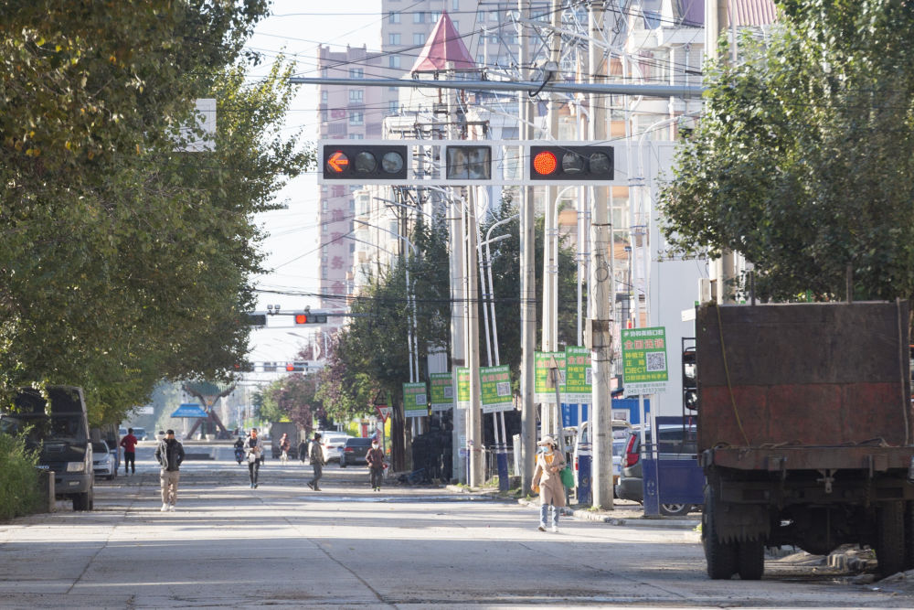 ↑居民在黑龙江省哈尔滨市巴彦县一街道上行走,巴彦县对部分地区实行交通信号灯红灯管制。