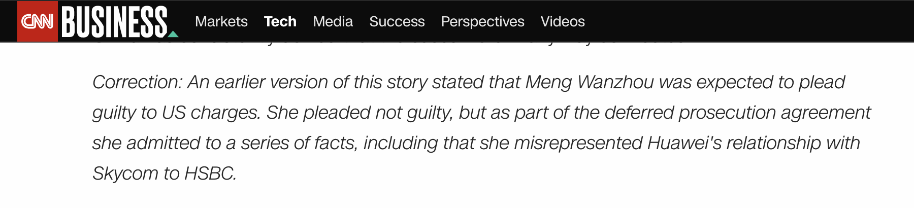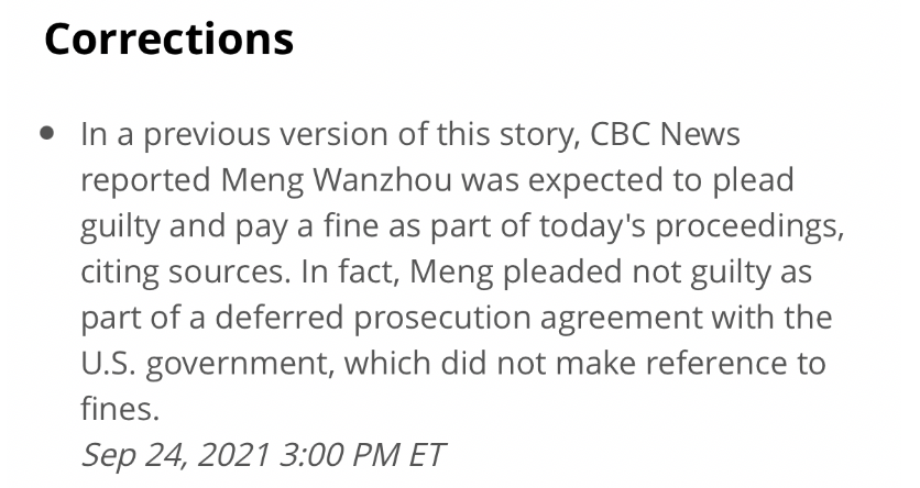 多家美国和加拿大媒体的报道也被打脸,他们在刊文报道之后,纷纷忙不迭发布更正声明称:事实上,孟晚舟在与美国政府的暂缓起诉协议中没有认罪,协议中没有提到罚款。
